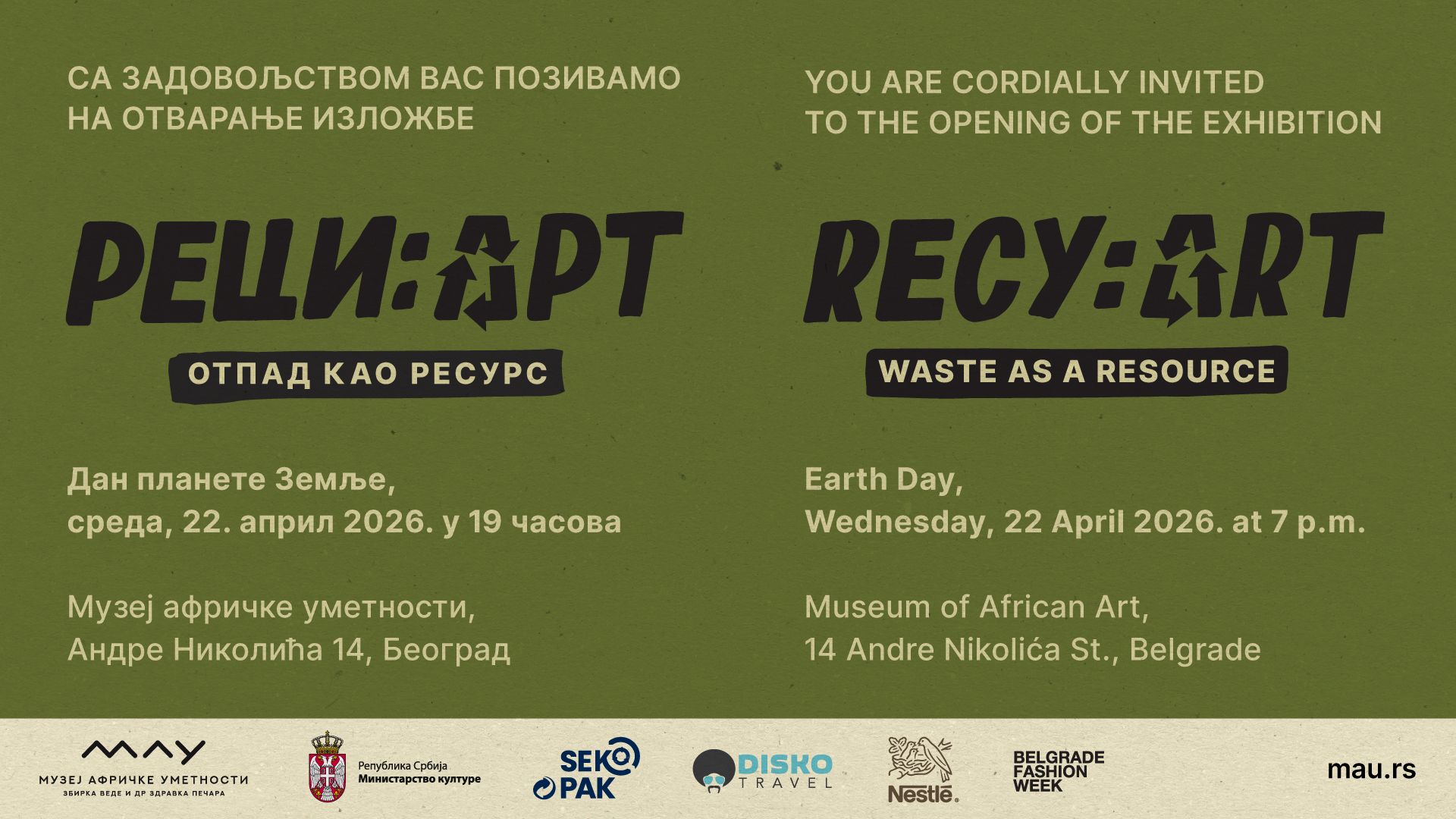 Izložba „Reci: Art – Otpad kao resurs” autorke Ivane Vojt biće otvorena u sredu, 22. aprila u 19 časova u Muzeju afričke umetnosti u Beogradu (MAU).