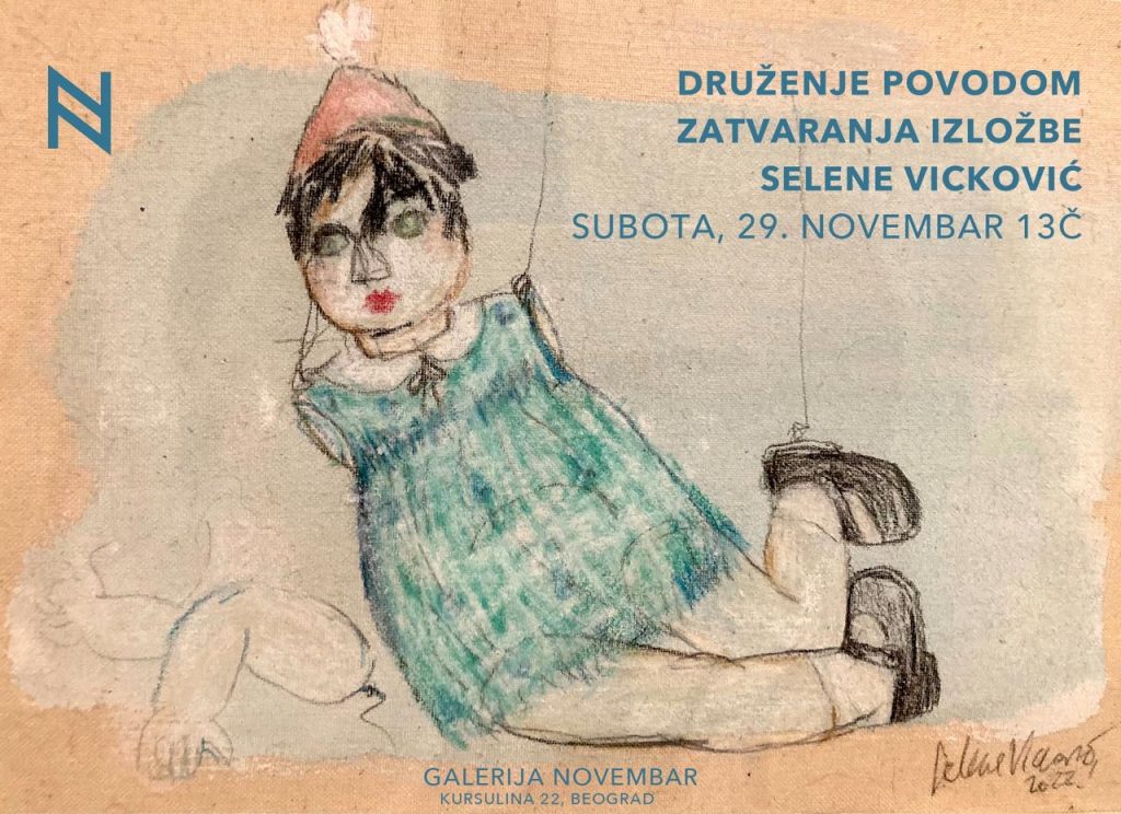 Ukoliko još uvek niste pogledali izložbu Selene Vicković „Ide maca oko tebe…“, koja je od sredine oktobra postavljena u galeriji Novembar na Vračaru, poslednja, a i posebna prilika je ovog vikenda. Naime, u subotu, 29. novembra, galerija Novembar organizuje druženje sa umetnicom, od 13 časova.